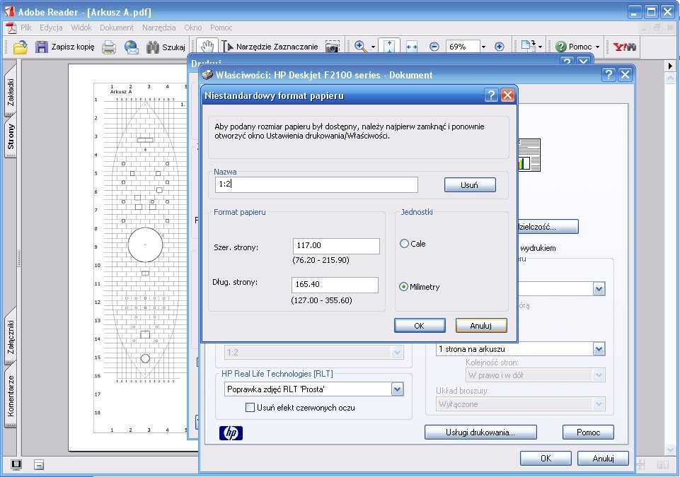 Wchodzimy we Właściwości i Funkcje, gdzie tworzymy nowy rozmiar strony (stronę niestandardową) o wymiarach (117 mm x 165 mm). Możemy ją nazwać np. 1:2.