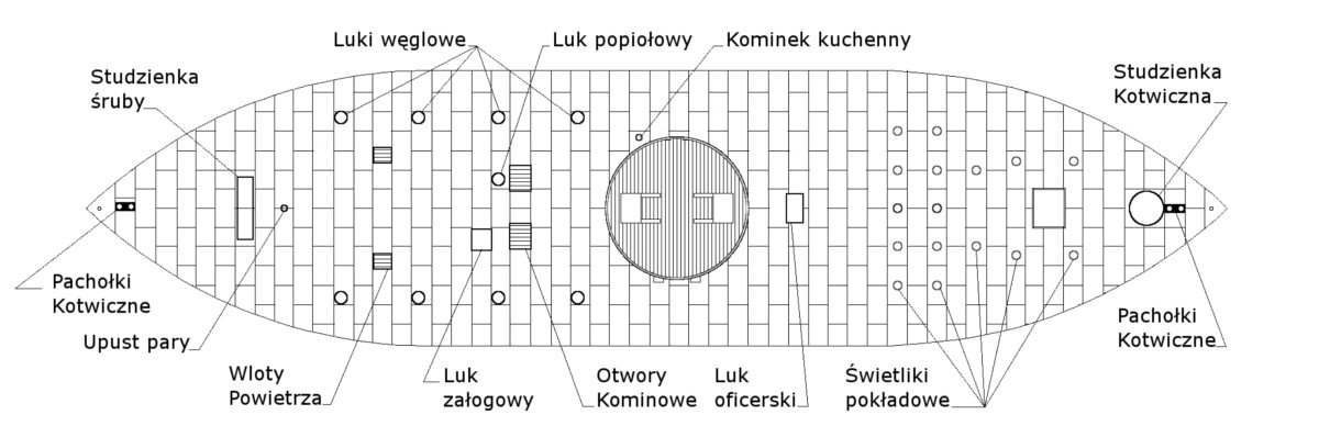 Na pokładzie znajdowało się okrągłych osiem luków węglowych i jeden luk popiołowy. Do wykonania ich imitacji będziemy potrzebować specjalnego przyrządu, który robimy z gwoździa o średnicy 1,5 mm.