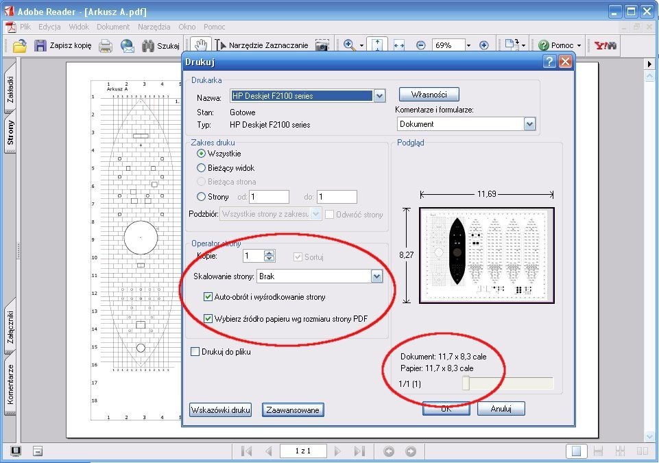 1. Ustawiamy we właściwościach drukowania stronę A4 (210mm x 297mm)