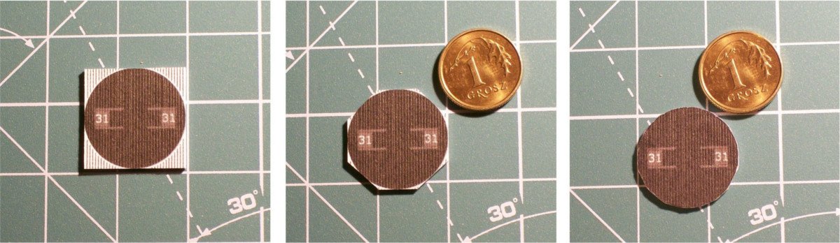 Jednym z trudniejszych elementów do wykonania jest dach wieży. Prawa geometrii są nieubłagane. Jeżeli przy wycinaniu okręgu przez pomyłkę zmniejszymy promień o 0,5 mm to obwód zmniejszy się o 3 mm. Z tego powodu łatwiej jest najpierw skleić boczną ścianę walca i do niej dopasować podstawy niż na odwrót. Na wycinanie idealnie symetrycznych kółek jest wiele patentów. Poniżej jeden z nich.