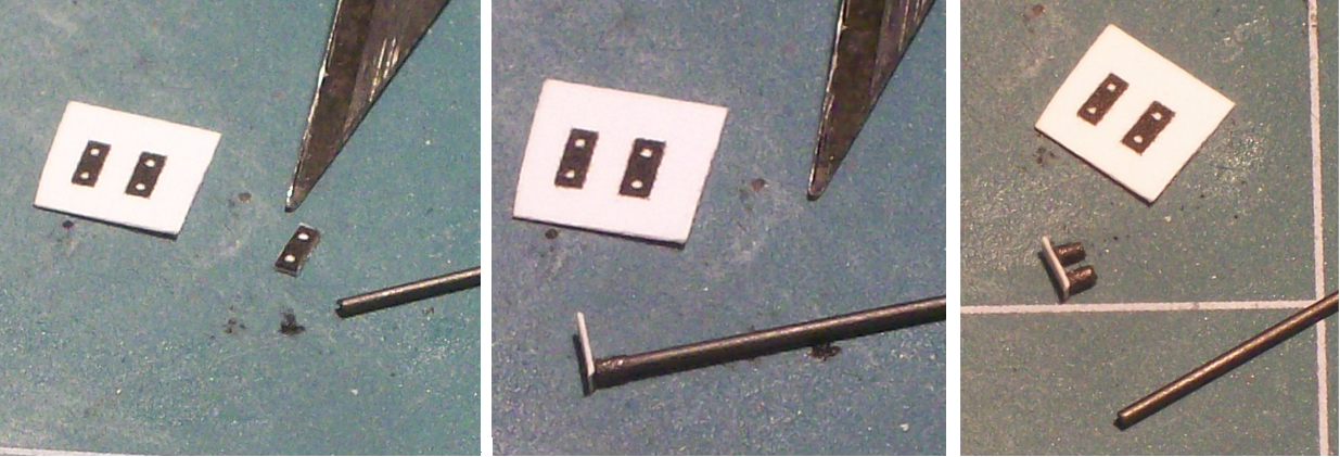 Pachołki cumownicze robimy z czterech odcinków grafitowych wkładów do ołówka automatycznego o grubości 0,5 mm, który należy połamać na kawałki o grubości 1,5 mm za pomocą pesety. Pachołki przyklejamy do części podstawy cyjanopanem.